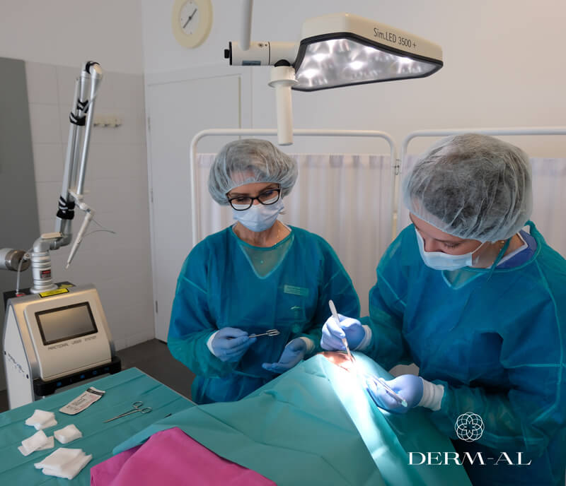 Zespół Derm-Al to lekarze specjaliści z wieloletnią praktyką: dermatolodzy, alergolodzy, chirurdzy, laryngolodzy, endokrynolodzy, podolodzy i lekarze zajmujący się medycyną estetyczną, a także pielęgniarki zapewniające bezpieczeństwo i komfort pacjentów oraz rejestratorki dbające o sprawną i profesjonalną obsługę.